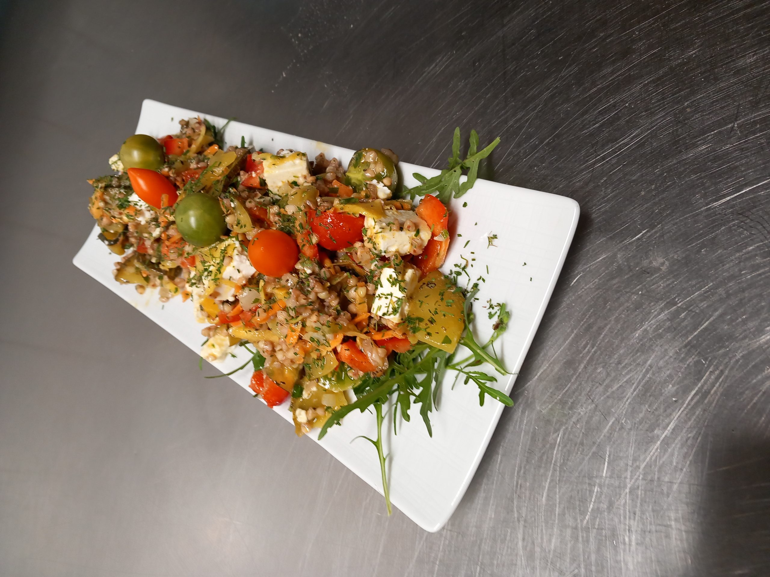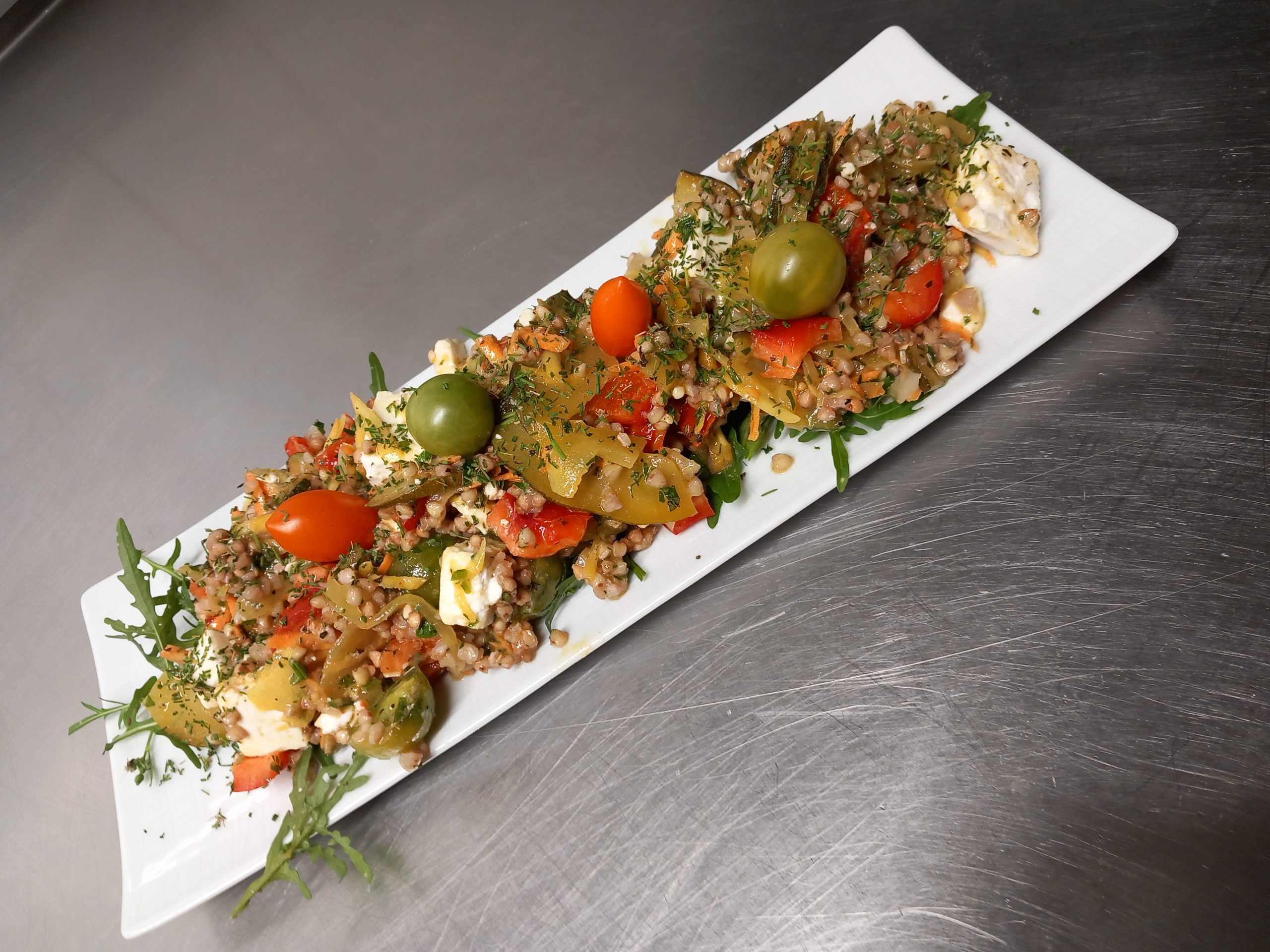 In einer Schüssel Senf, Kräuter, Essig und Gewürze verrühren. Öl unter ständigem rühren langsam dazuträufeln; mit Salz und Pfeffer abschmecken. Karotte und Zucchini raspeln, Paprika in 1 cm Würfeln schneiden; alles mit der Dressing vermengen. Fetakäse in 2 cm Würfeln schneiden, mit Tomaten, Buchweizen und mariniertem Gemüse vorsichtig vermengen. Den Rucola auf die Teller verteilen und den Salat darauf verteilen. Einige Tomaten und Fetawürfeln zur Garnierung oben darauf geben.